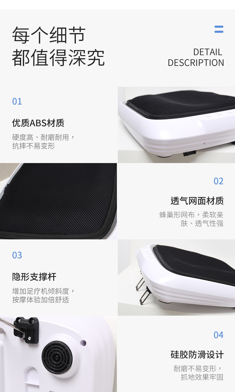 功能特征:腳底六個按摩頭,三檔力度調(diào)節(jié),按摩頭正反轉(zhuǎn),按摩頭加熱,15分鐘定時,可拆洗腳套,按鍵控制面板